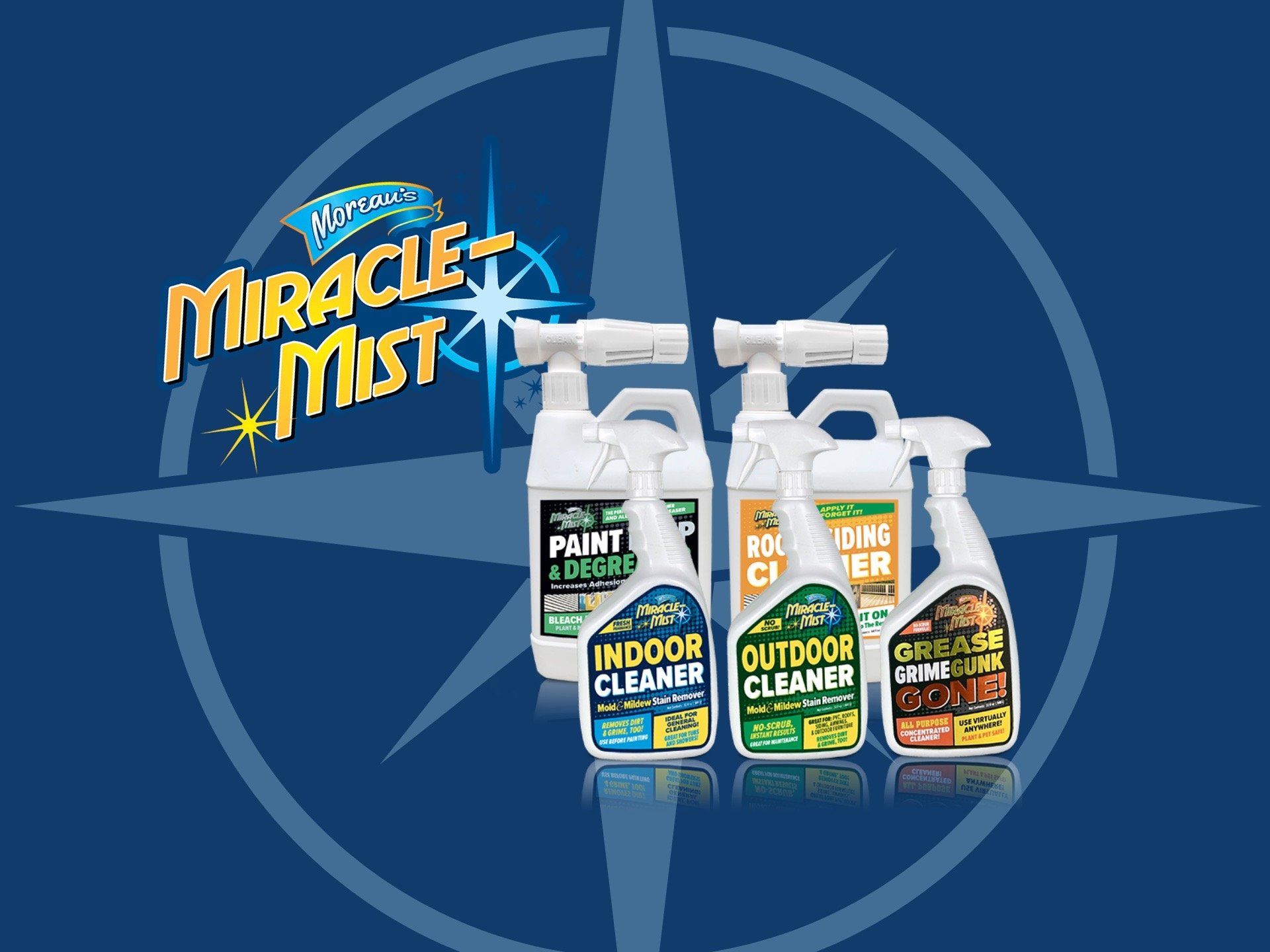 The MiracleMist family of household cleaners are second to none in efficacy. The collection includes solutions for mold stains, mildew stains, de-greasing applications, roof and siding, indoor & bathroom, and mold stain prevention treatments.